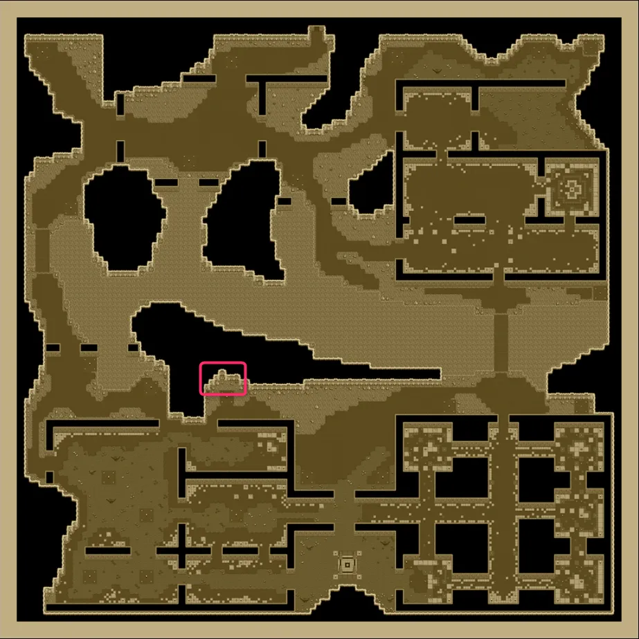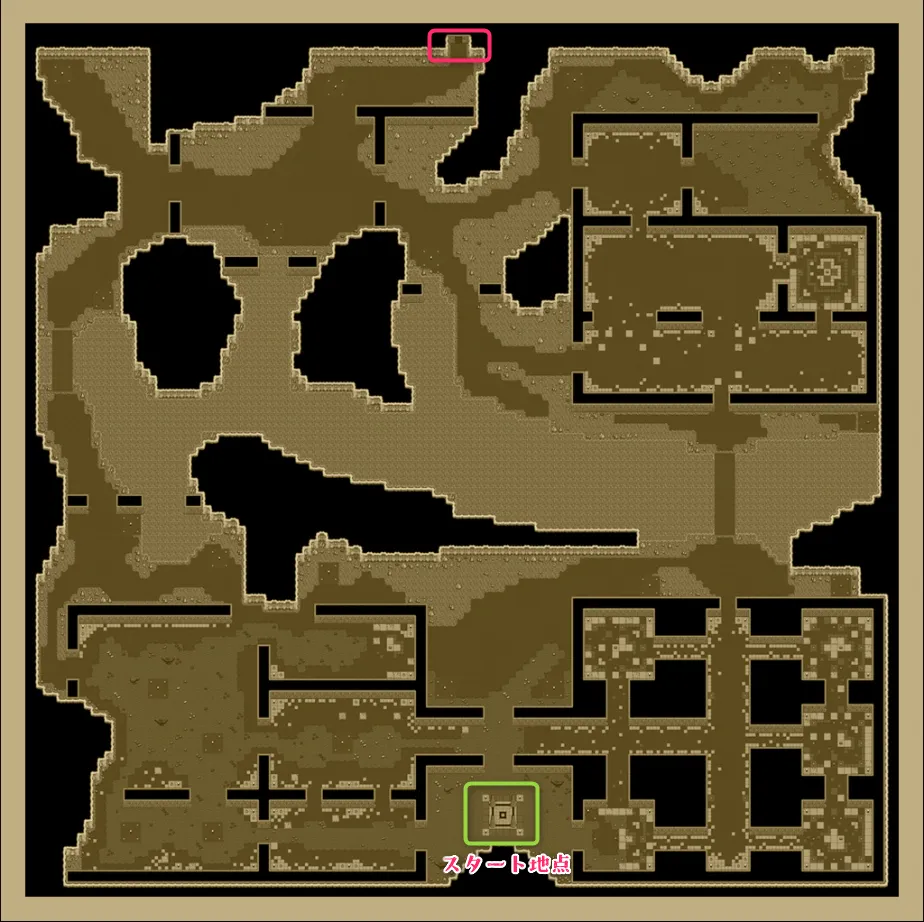 スタート地点からまっすぐ北に向かい、小さなレンガに囲まれた部屋を超えてさらに北に向かうとあります。