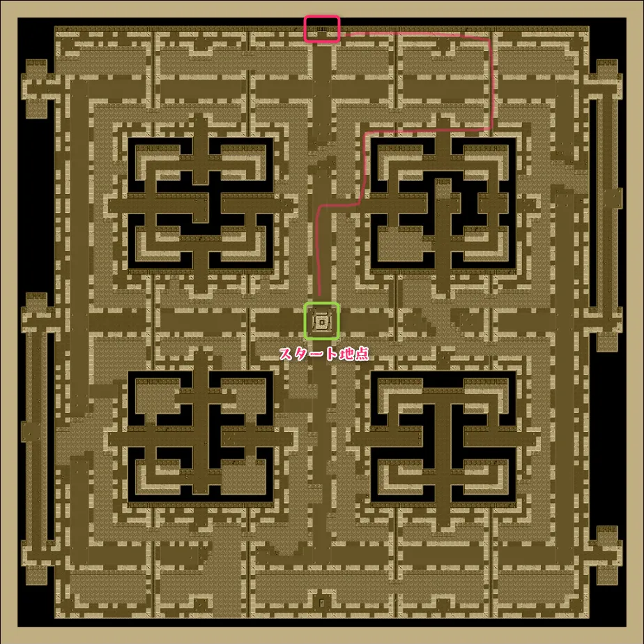 文字で一番わかりやすく言うと、とりあえずスタート地点から少し北に出て左の道をまっすぐ左に進み、その後左手壁に沿って歩いて行くのがベストかなと思います。