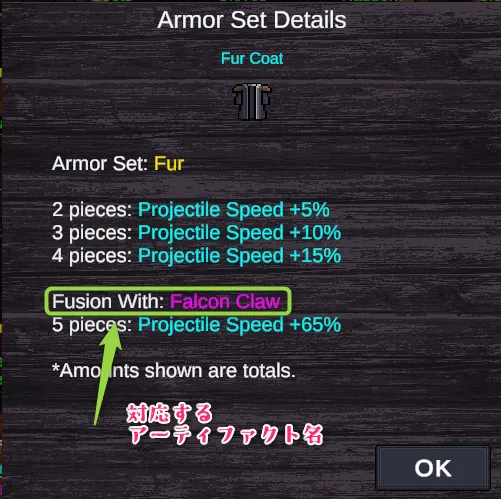 防具4種までだとProjectile speedが15%までしか上がりませんが、アーティファクト「Falcon claw」を装備してLvをMAX(5)まで上げることで、Fusionされ(アーマー+特定アーティファクトによるセットボーナスを得られ)、なんとその数値が65%まで跳ね上がります。