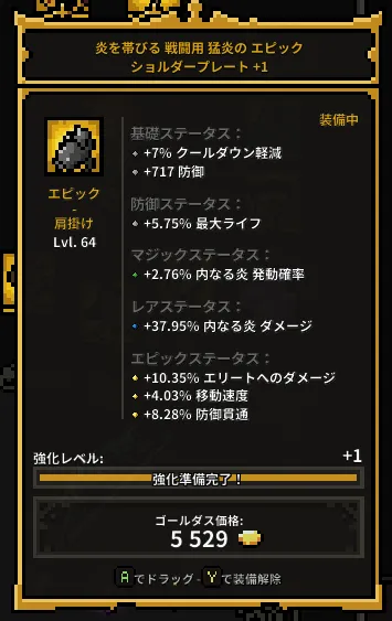 防具はハクスラ系おなじみのベースアイテムによるステータス+装備のレア度による追加ステータス。