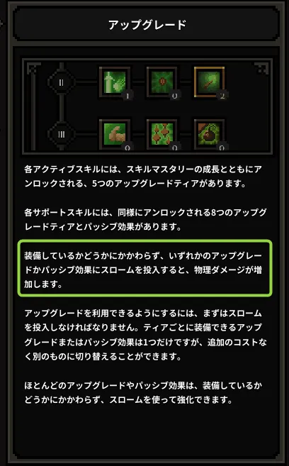 実はこれ、適用されていないものでもレベルを上げるとそのスキルのダメージが上がります。