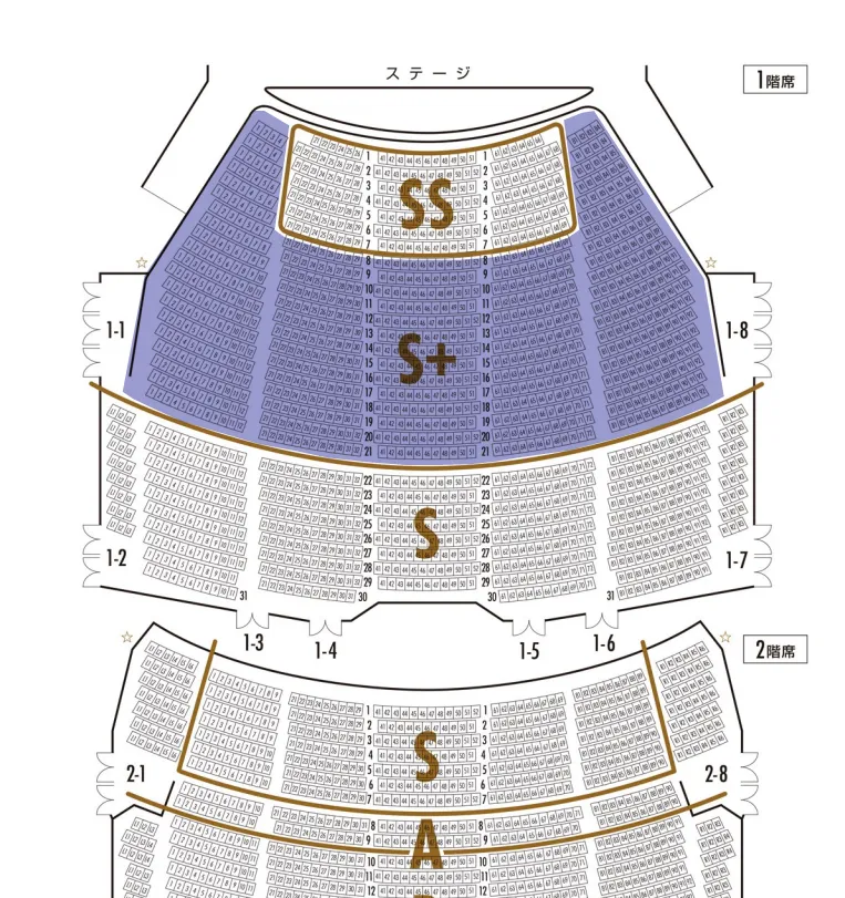 前方といっても8列〜21列までと幅はありますが、少なくとも「S席の2階や後方になる可能性がない」のはハッキリしたメリットですね。
