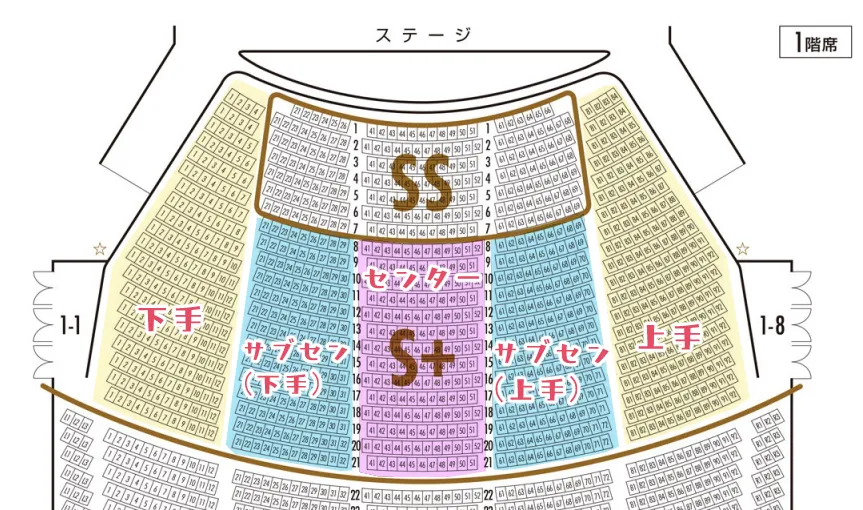 座席表にもある通り、一番上手と下手であれば、1列目もS+席扱いなので、