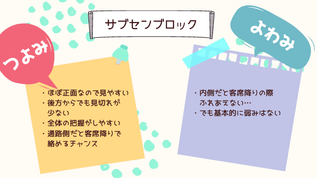 そのため、通路側(サブセン側)に座れた場合、「ほぼSS席」なので非常にお得です(笑)。